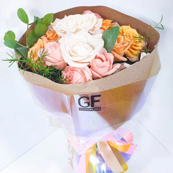Красочный и в тоже время нежный и изящный букет, расскажет о многообразии Ваших чувств и их наполненности. Свежая цветовая палитра, изысканные формы, непередаваемая красота роз, в одном букете.